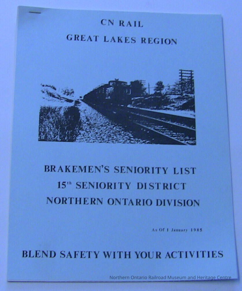 A 1985 seniority list for CN Locomotive Engineers in the 15th Seniority District of the Northern Ontario Division of the Great Lakes Region.Collection