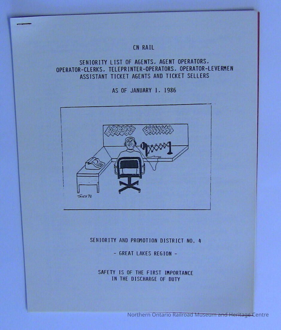 A 1986 seniority list for CN Agents, Agent Operators, Operator Clerks, Teleprinter Operators, Operator-Levermen, Assistant Ticket Agents, and Ticket Sellers in the 4th Seniority District of the Northern Ontario Division of the Great Lakes Region.Collection