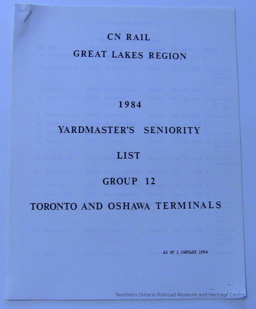 CN Rail Great Lakes Region Yardmaster's Seniority List, Group 12, Toronto and Oshawa Terminals, January 1984Description
