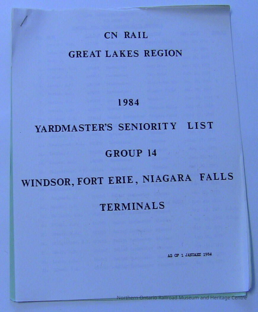 A 1984 seniority list for CN Yardmasters at the Windsor, Fort Erie, and Niagara Falls Terminals.Collection