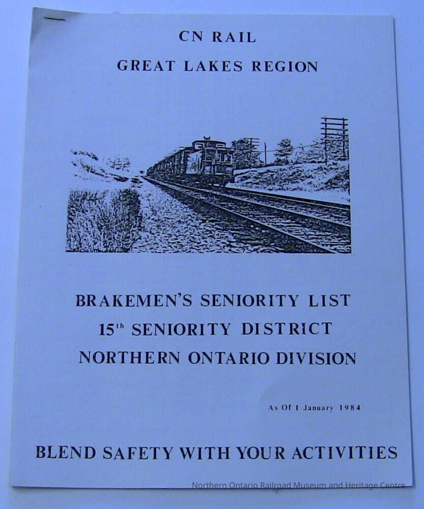 CN Rail Great Lakes Region Brakemen's Seniority List, 15th Seniority District, Northern Ontario Division, January 1984Description