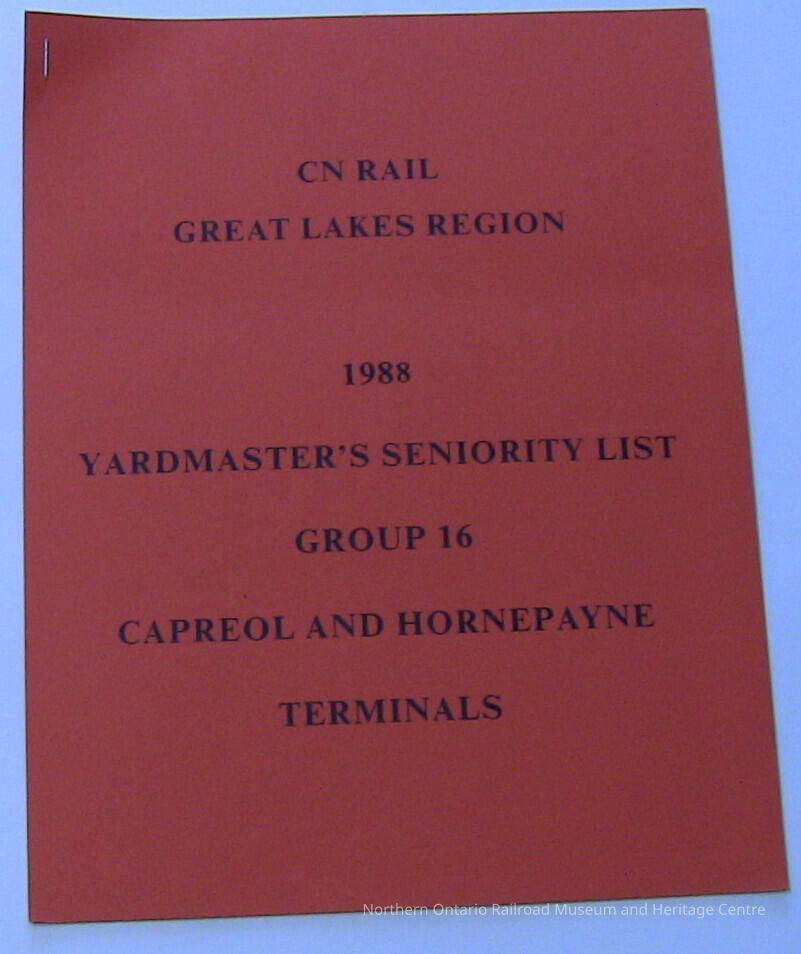 A 1988 seniority list for CN Yardmasters at the Capreol and Hornepayne Terminals.Collection