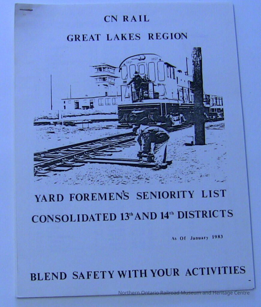 A 1983 seniority list for CN Yard Foremen in the Consolidated 13th and 14th Districts of the Great Lakes Region.Collection