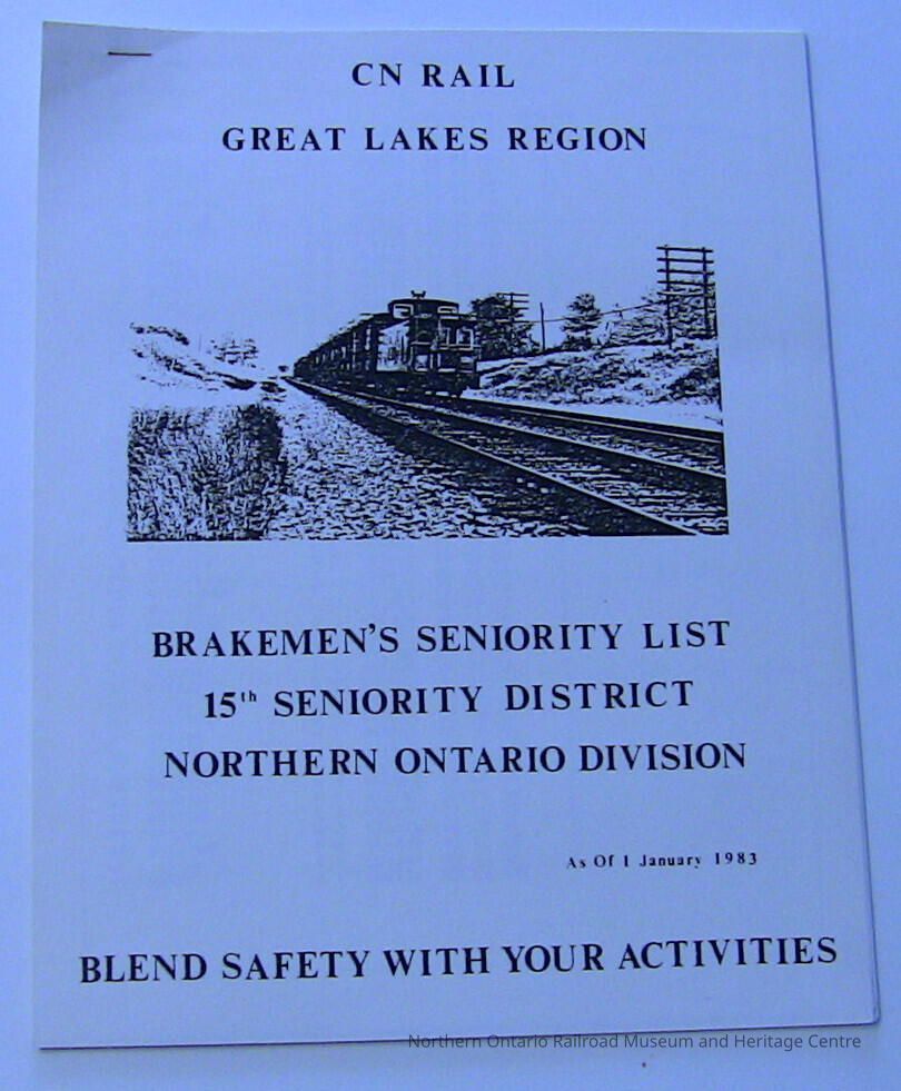 A 1983 seniority list for CN Brakemen in the 15th Seniority District of the Great Lakes Region.Collection