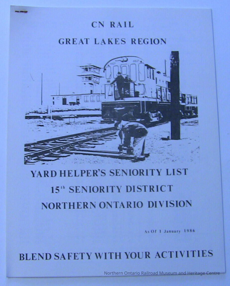 A 1986 seniority list for CN Yard Helpers in the 15th Seniority District in the Northern Ontario Division of the Great Lakes Region.Collection