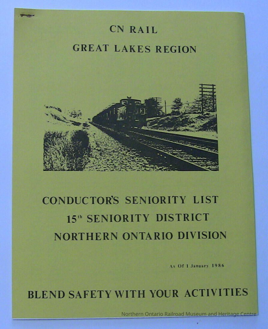 CN Rail Great Lakes Region Conductor's Seniority List, 15th Seniority District, Northern Ontario Division, January 1986Description