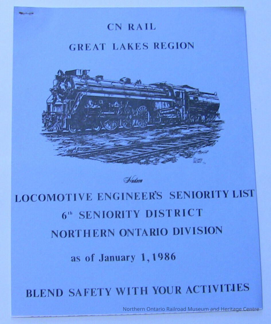 A 1986 seniority list for CN Locomotive Engineers in the 6th District of the Northern Ontario Division in the Great Lakes Region.Collection