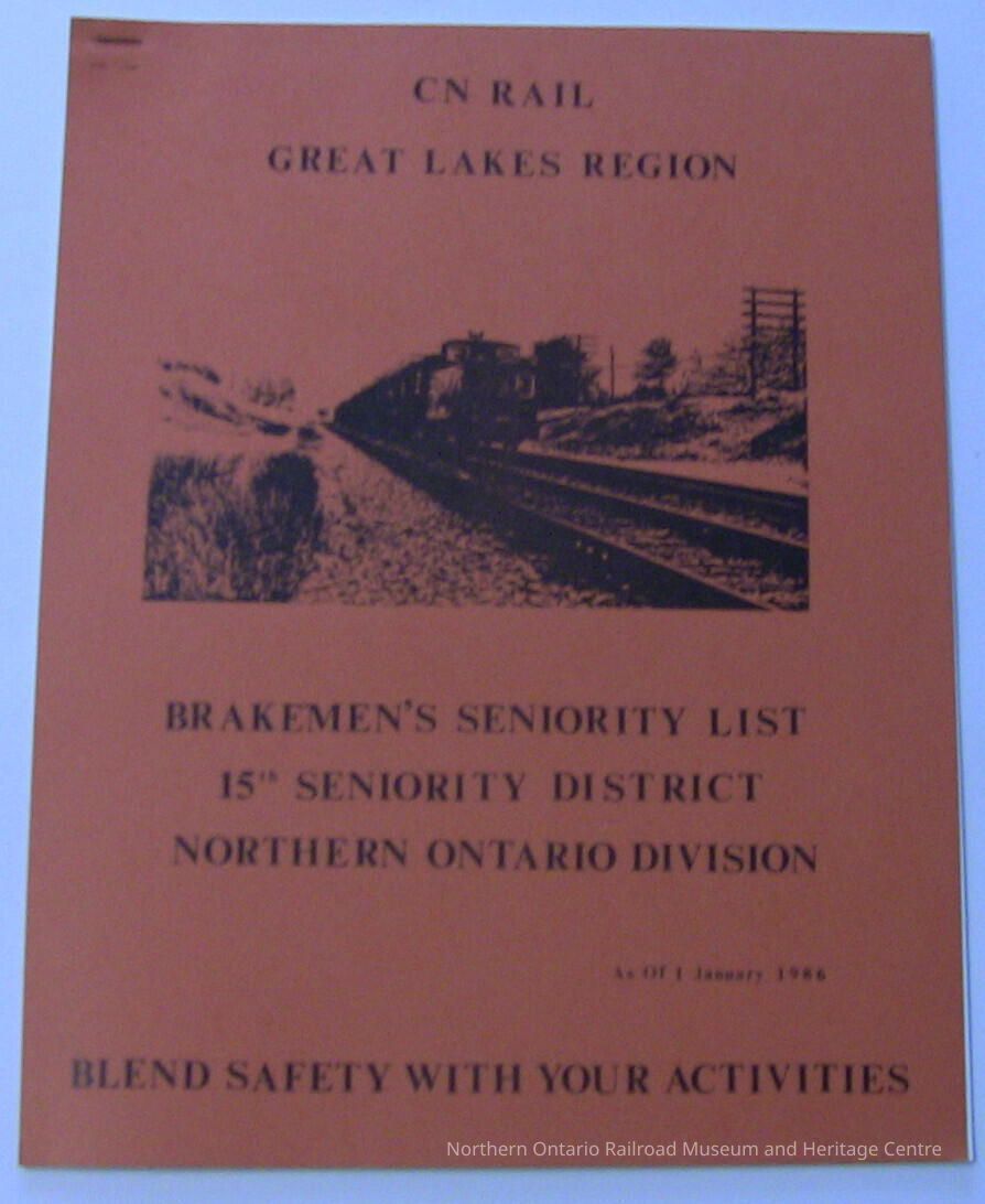 A 1986 seniority list for CN Brakemen in the 15th Seniority District in the Northern Ontario Division of the Great Lakes Region.Collection