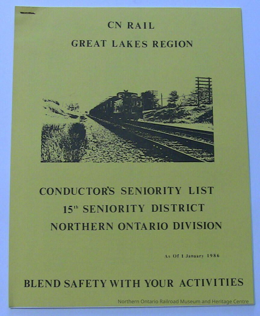 A 1986 seniority list for CN Conductors in the 15th Seniority District in the Northern Ontario Division of the Great Lakes Region.Collection