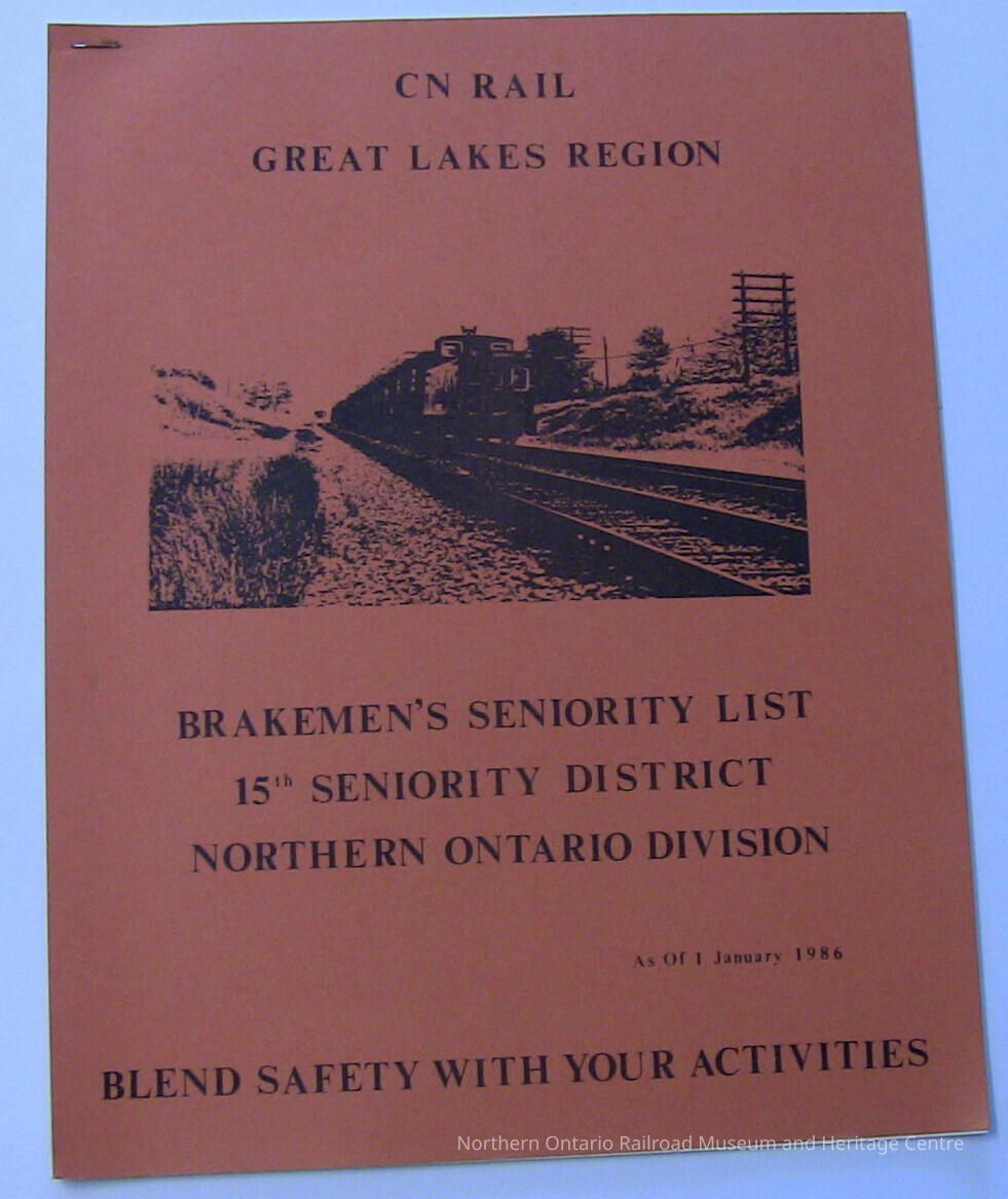 A 1986 seniority list for CN Brakemen in the 15th Seniority District in the Northern Ontario Division of the Great Lakes Region.Collection