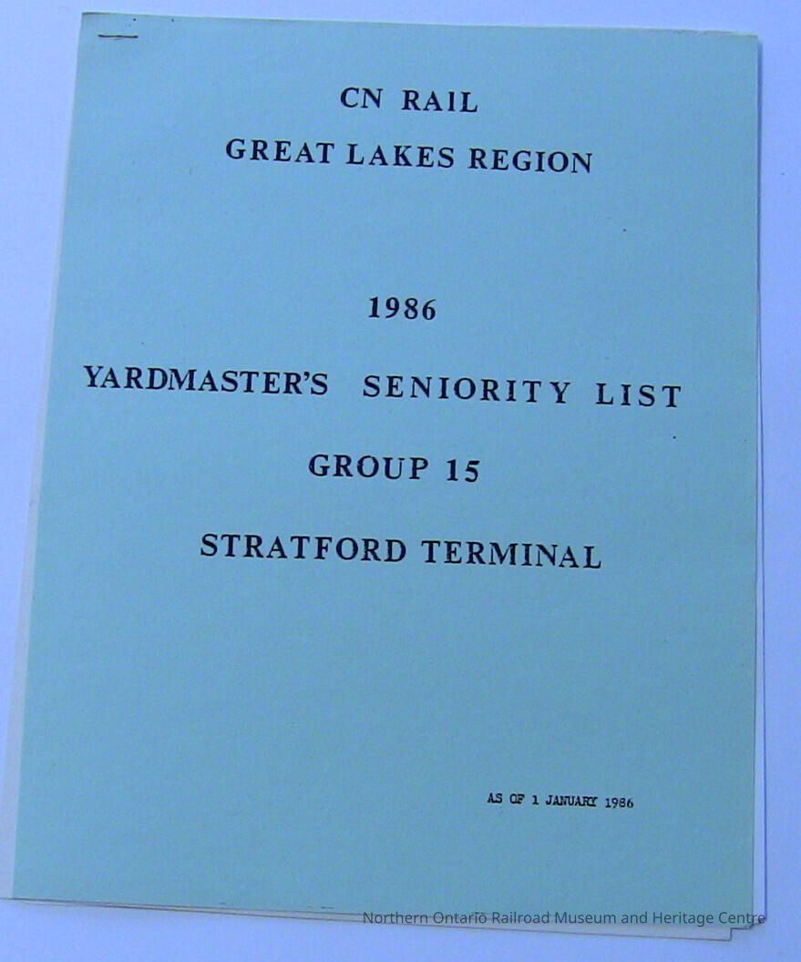 A 1986 seniority list for CN Yardmasters at the Stratford Terminal.Collection