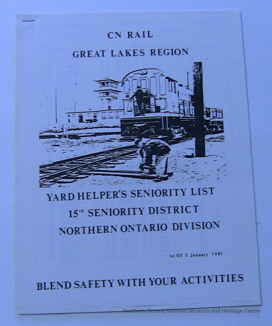 A 1981 seniority list for CN Yard Helpers in the 15th Seniority District in the Northern Ontario Division of the Great Lakes Region.Collection