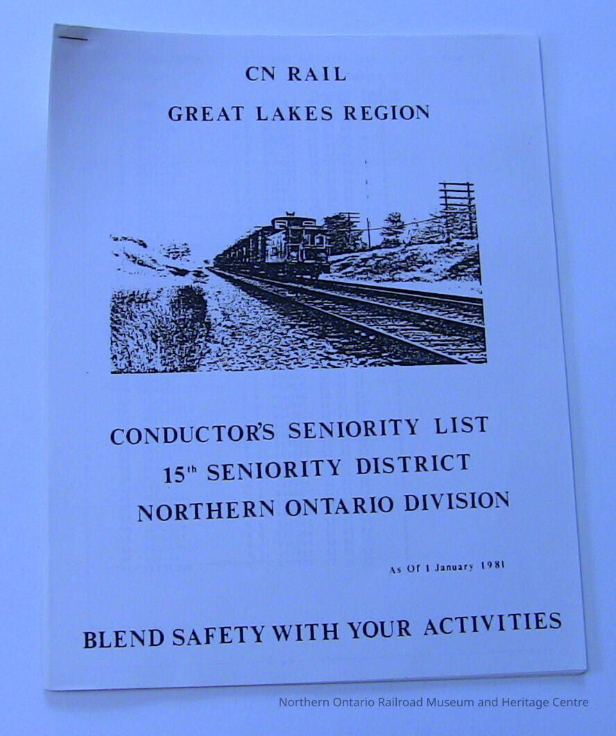 A 1981 seniority list for CN Conductors in the 15th Seniority District in the Northern Ontario Division of the Great Lakes Region.Collection