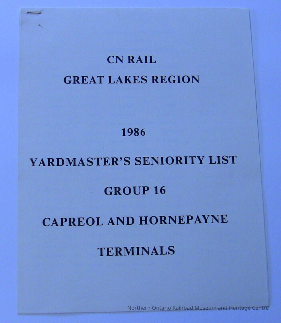 A 1986 seniority list for CN Yardmasters at the Capreol and Hornepayne Terminals.Collection