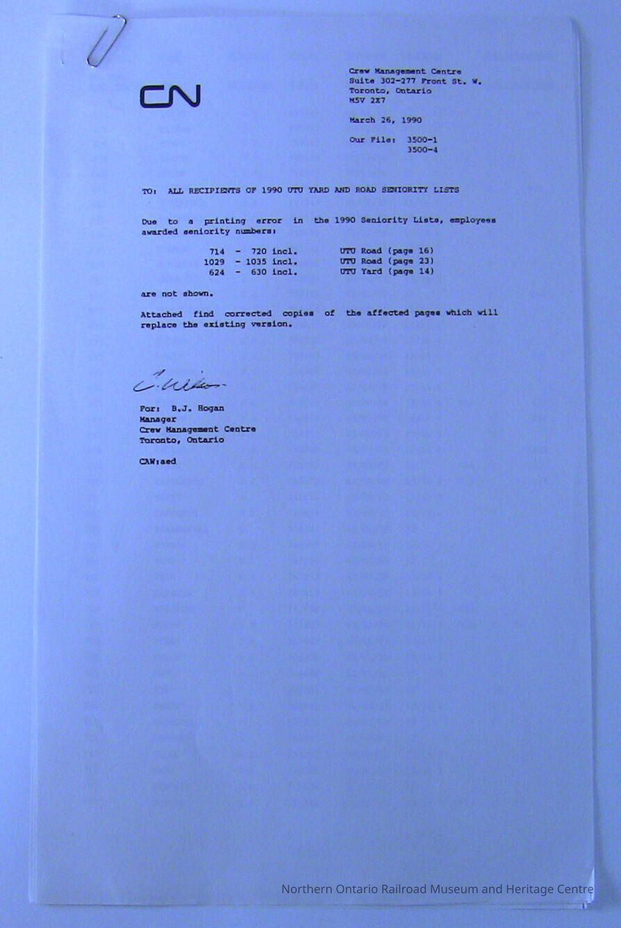 Canadian National Railway- 1990 UTU Yard and Road Seniority Lists Misprint CorrectionDescription