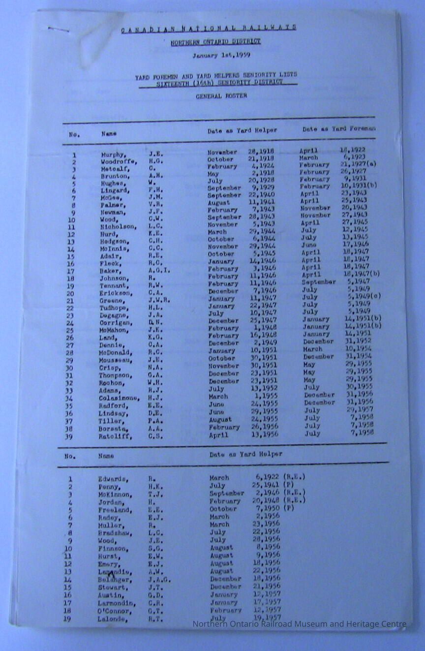 Canadian National Railways, Northern Ontario District, 16th Seniority District, Yard Foremen and Yard Helpers Seniority List, January 1st 1959Description
