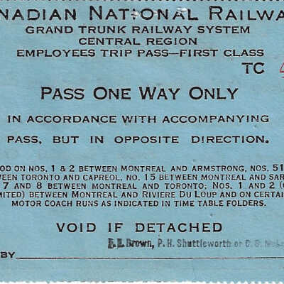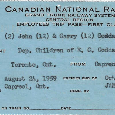 Canadian National branded employee trip pass assigned to John (age 2) and Garry (age 12) Goddard. Both of which are dependant children of E. C. Goddard, a locomotive engineer. The pass was assigned on August 25th, 1959 and it was valid until the end of October 1959. It was for a first class trip from Capreol Ontario to Toronto Ontario and back.Context