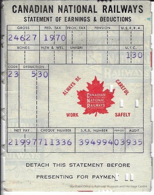 Canadian National branded statement of earnings and deductions belonging to Frank Mazzuca, the exact year is unknown, however it was issued for a pay period during the 1959 year.Context
