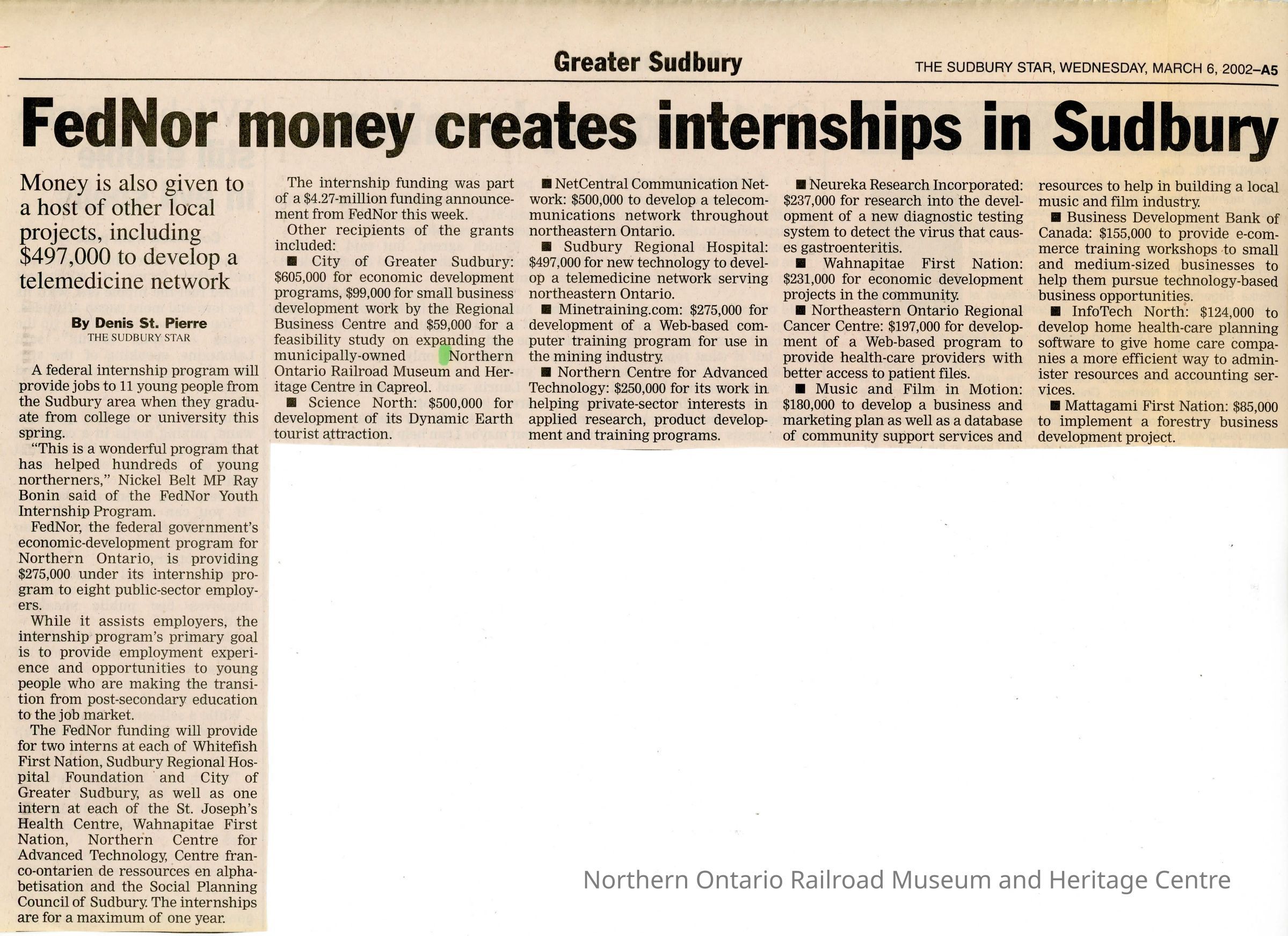 "FedNor money creates internships in Sudbury" In The Sudbury StarDescription