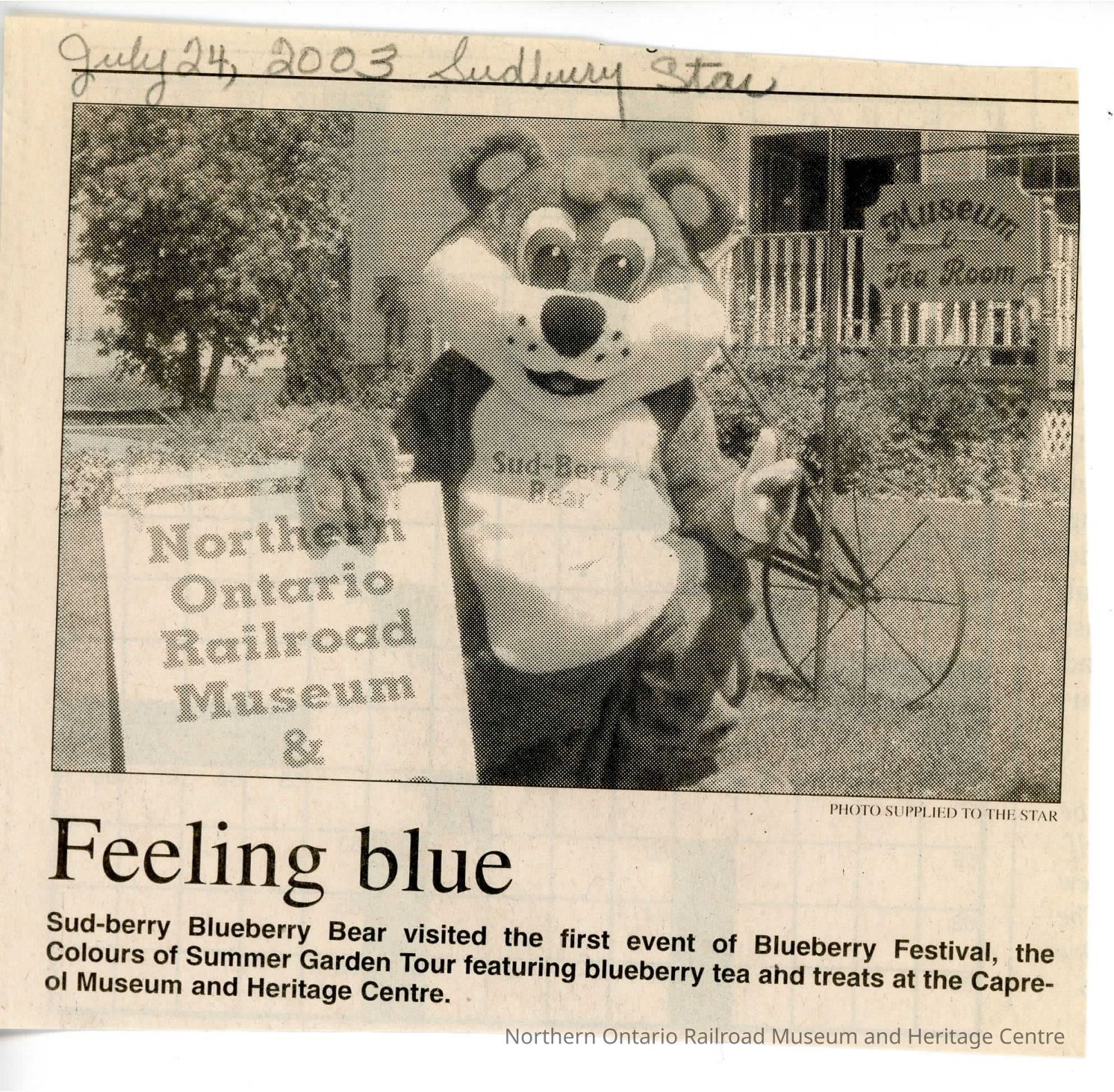 "Feeling Blue" In the Sudbury Star on July 24, 2003, featuring the Blueberry Bear at NORMHC for the Blueberry Festivals.Collection