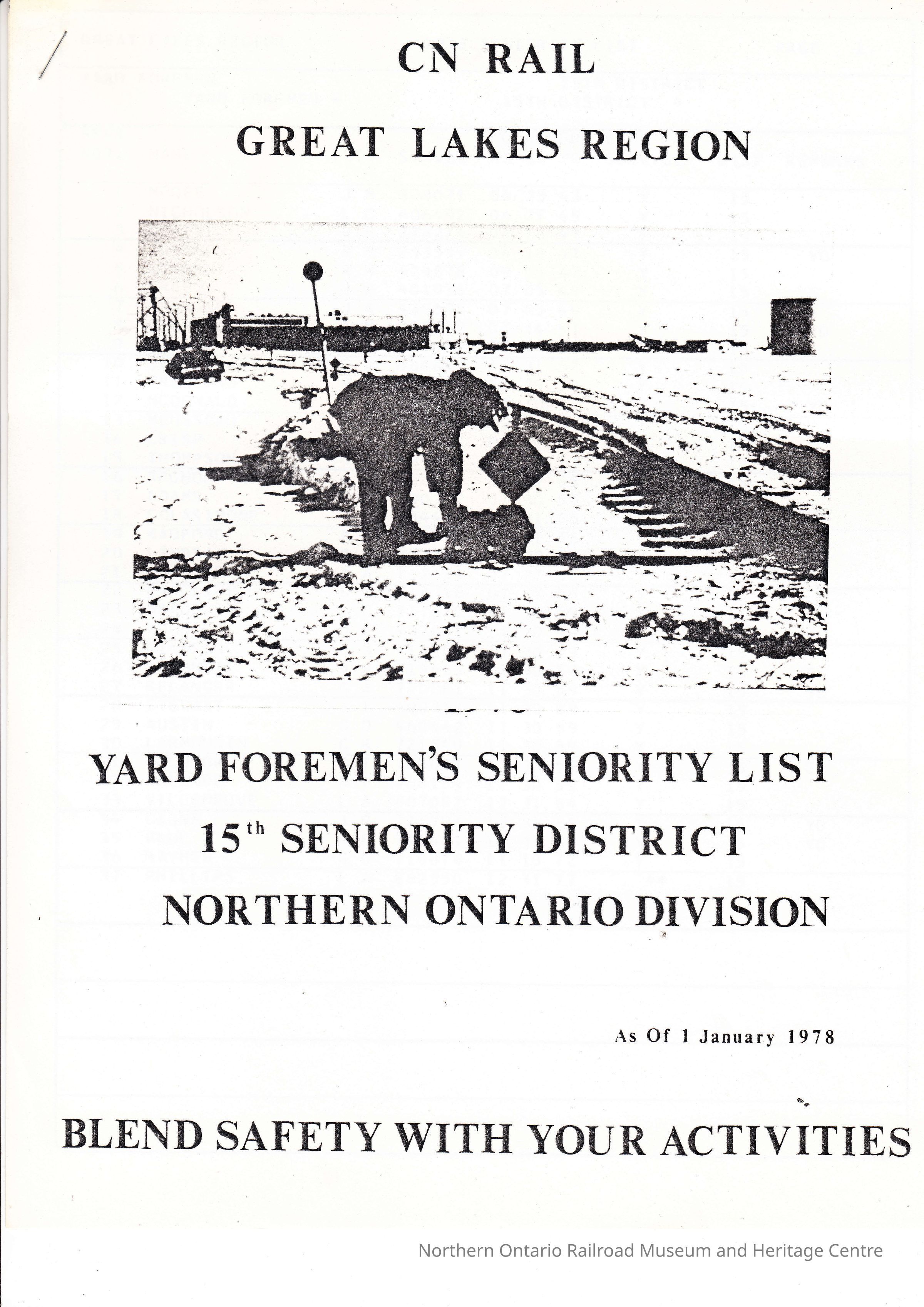 CN Rail- Yard Foremen's Seniority List, 15th Seniority District, Northern Ontario Division, January 1 - 1978Description