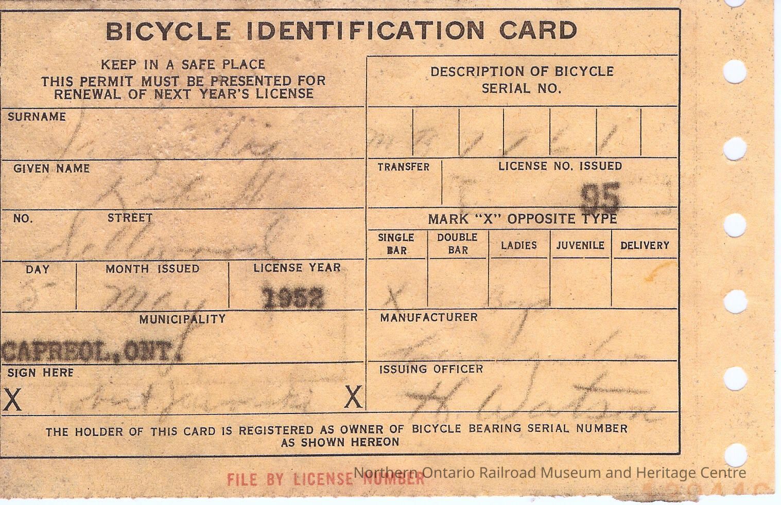 Bicycle Identification Card issued by the Municipality of Capreol, Ontario in 1952. Includes the bicycle's serial number and manufacturer. Signed by an issuing officer and the card holder.