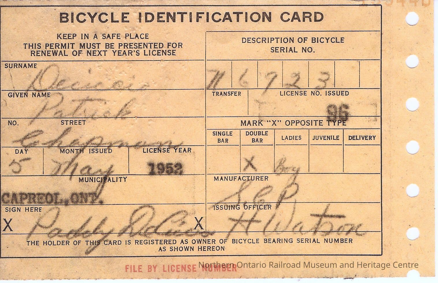 Bicycle Identification Card issued to Patrick Deciccio by the Municipality of Capreol, Ontario in 1952. Includes the bicycle's serial number and manufacturer. Signed by an issuing officer and the card holder.