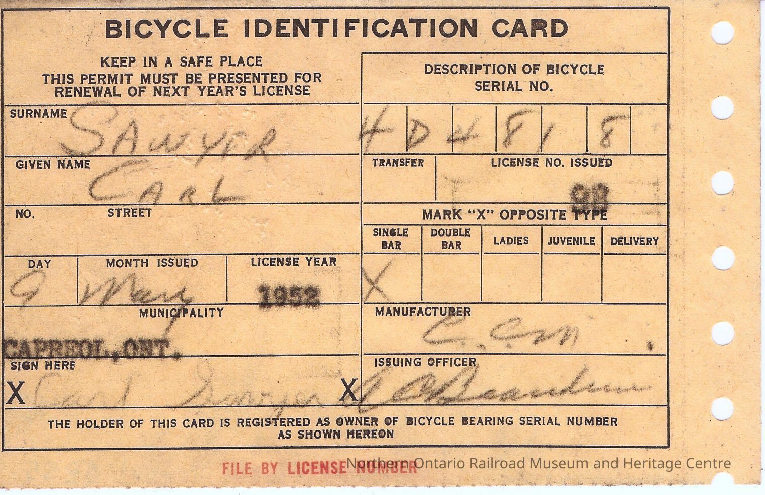 Bicycle Identification Card issued to Carl Sawyer by the Municipality of Capreol, Ontario in 1952. Includes the bicycle's serial number and manufacturer. Signed by an issuing officer and the card holder.