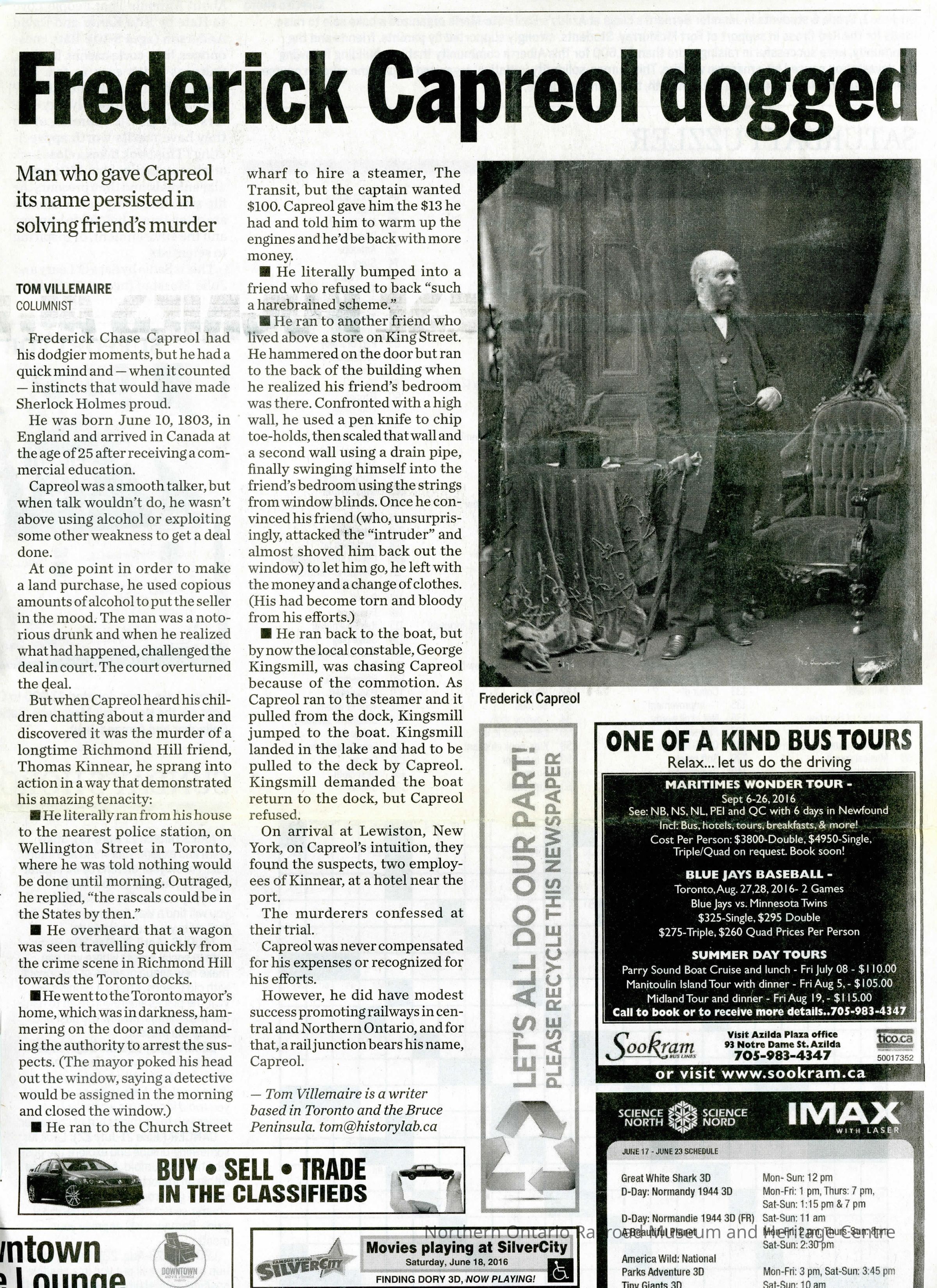"Frederick Capreol dogged" Article in The Sudbury Star, June 2016Description