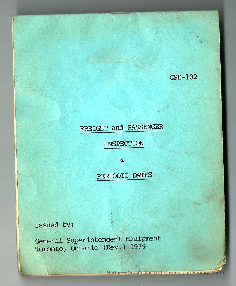 Booklet, compilation of instructions in regards to when equipment on freight and passenger trains should be inspected and how often these inspections should occur. It covers: freight cars, air brakes: AB-1-B, ABC-1, ABD-1, K brakes, Air brakes: ABD I.D.T. and S, Brake Shoe Change, Cotter Keys, hand brakes, pison travel, coupler heights, hand hold clearance, friction bearings, non-stabilized boxes, roller bearing periodic lubrication, trailer hitches, mechanical refers, insul boxes, wheels, side bearing clearance, reweighing empty cars, bulkhead doors, plug doors, sliding doors, other doors, hatch covers, precautions, passenger cars, air brakes: C.O.T and S, piston travel, body mounted cylinders, truck mounted cylinders, coupler heights, non-passenger carrying cars, friction bearings, approved for test lubricators, roller bearings, grease, fire extinguisher, first aid boxes, passenger side bearing clearances, sterilization water tanks, hand brakes, uncoupling mechanism, draft gear.