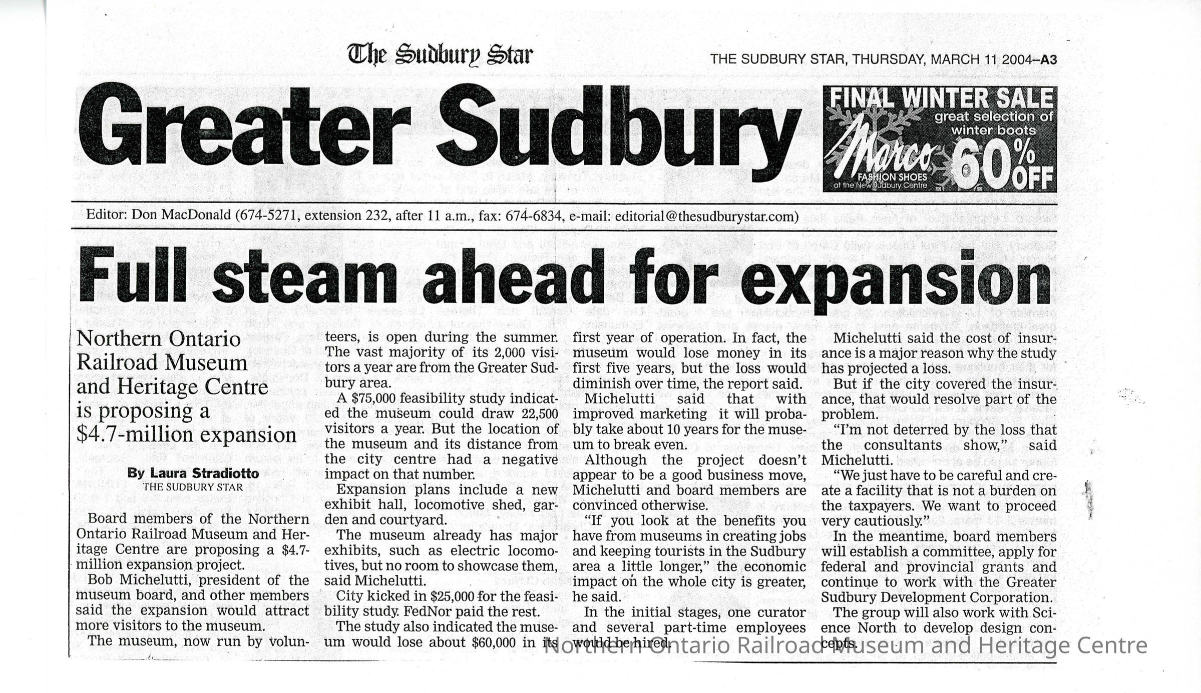 "Full Steam ahead for expansion" in The Sudbury Star on March 11, 2004, featuring the NORMHC feasibility study of 2004 for expansion.Collection