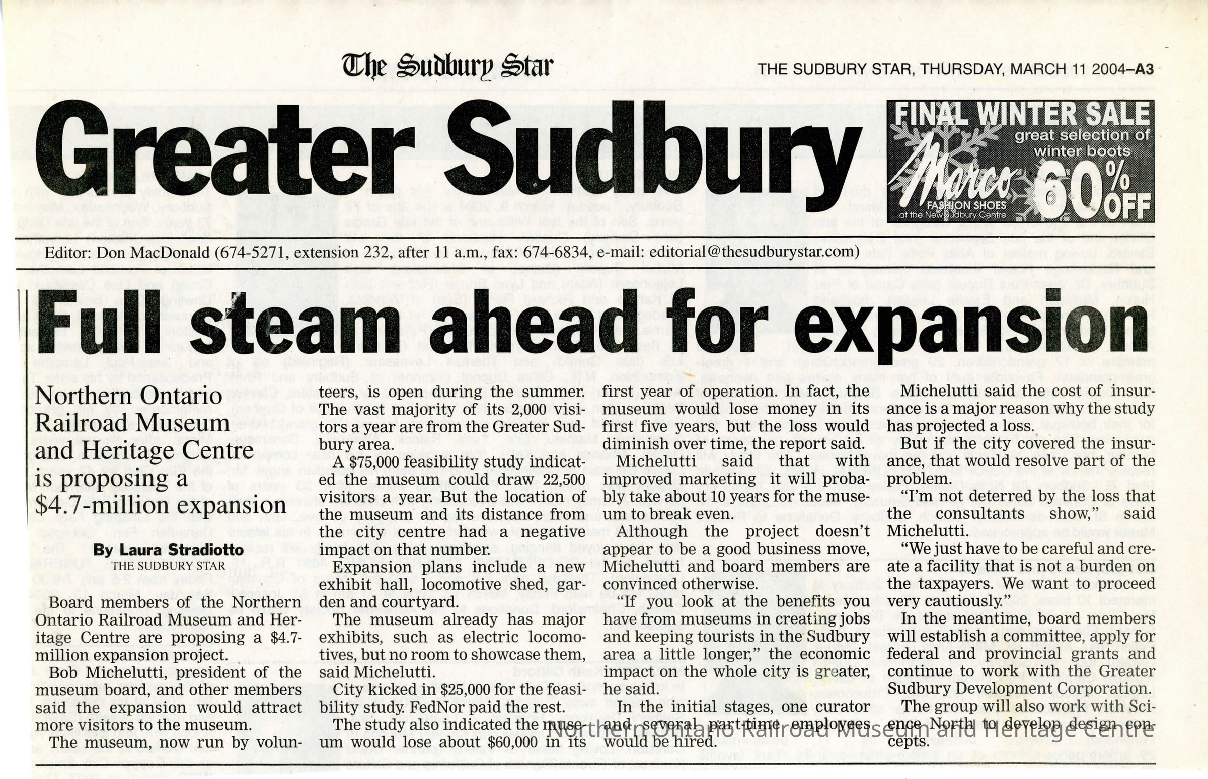 "Full Steam ahead for expansion" in The Sudbury Star on March 11, 2004, featuring the NORMHC feasibility study of 2004 for expansion.Collection