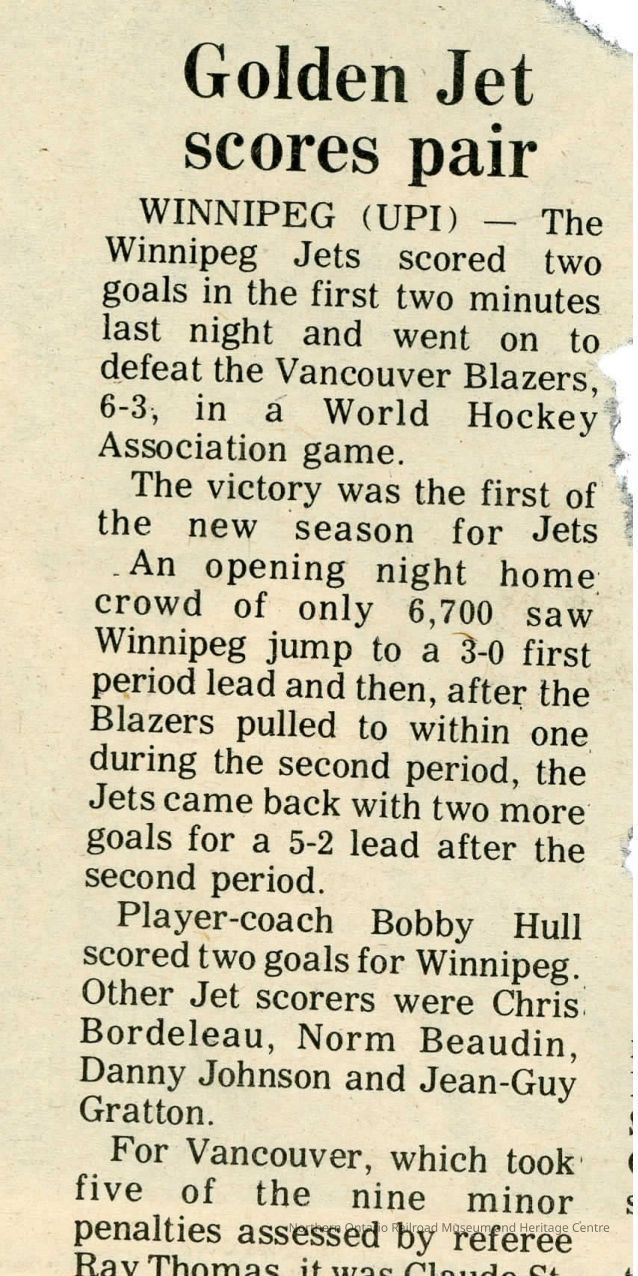 "Golden Jet scores a pair" in unknown newspaper. Ray Thomas mentioned as referee of game between Winnipeg Jets and Vancouver BlazersCollection