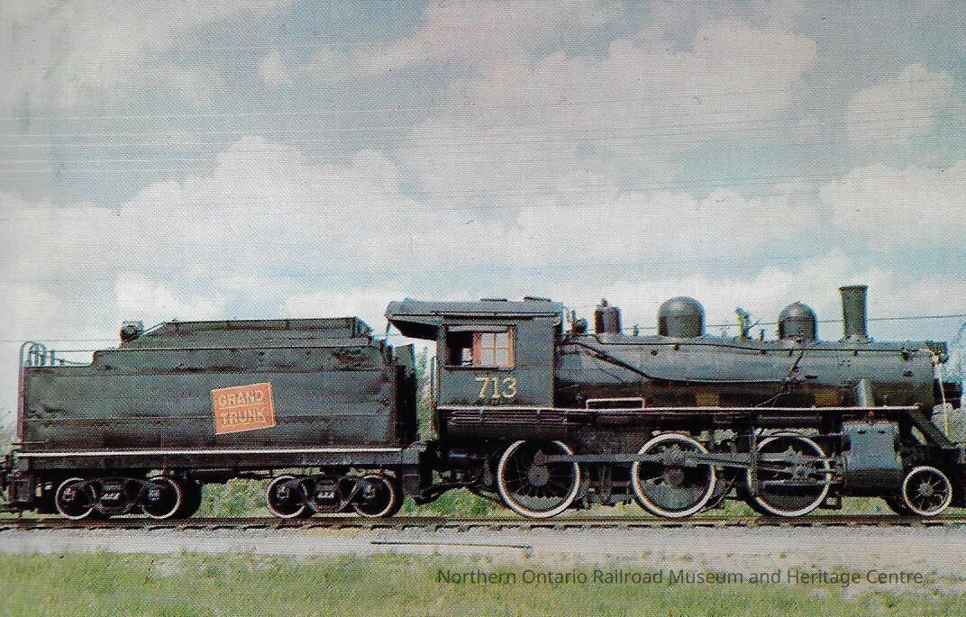 Grand Trunk postcard showing Steam Engine #713 at the National Museum of Science and Technology in Ottawa, Ontario. The front image shows the right side of the locomotive, so both the engine and tender are visible.