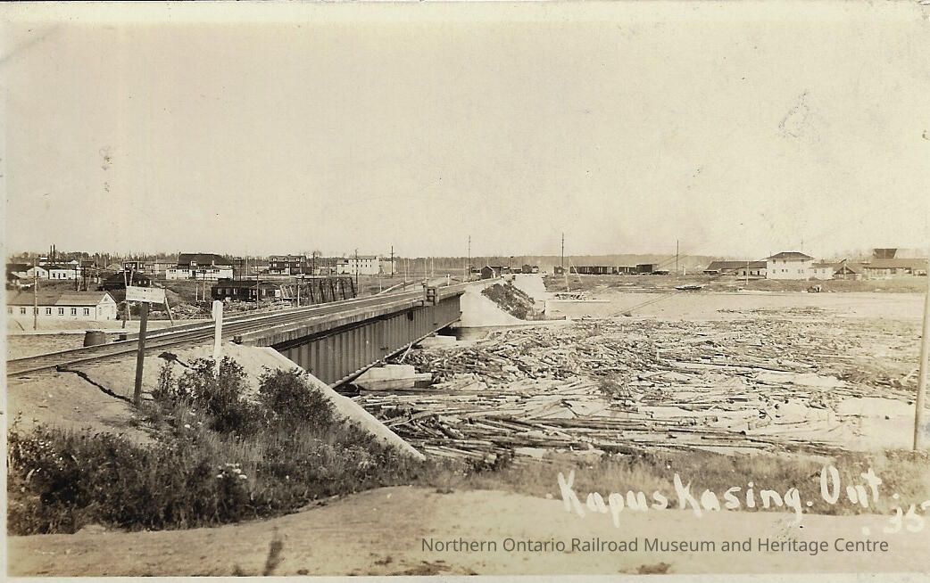 Postcard belonging to former Capreol mayor Harold Prescott. The postcard features an image of the landscape of Kapuskasing Ontario. It features a bridge over top of a body of water that is currently having logs being floated down it. In the background the rest of the town is visible.