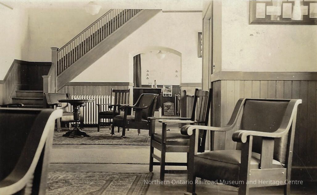 Postcard belonging to former Capreol mayor Harold Prescott. The postcard features an image of the interior of a hotel lobby. There is a stair case as well as several chairs and tables visible. In the background what is assumed to be the reception desk is also visible.