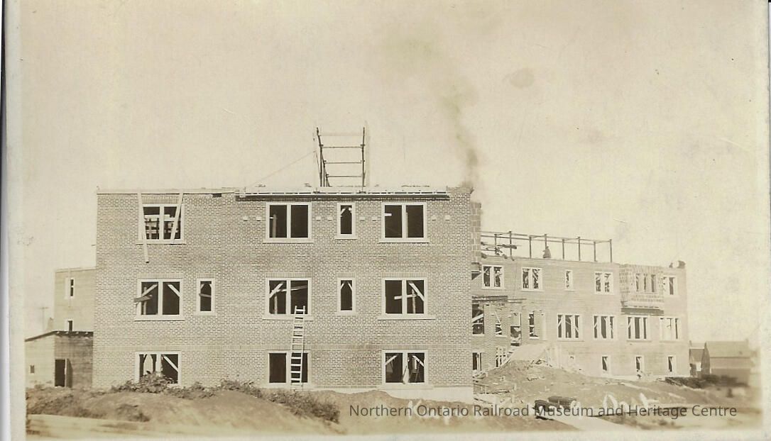 Postcard belonging to former Capreol mayor Harold Prescott. The postcard features an image of two buildings in Kapuskasing Ontario. The buildings appear to be under construction and it is unclear what its future use will be.