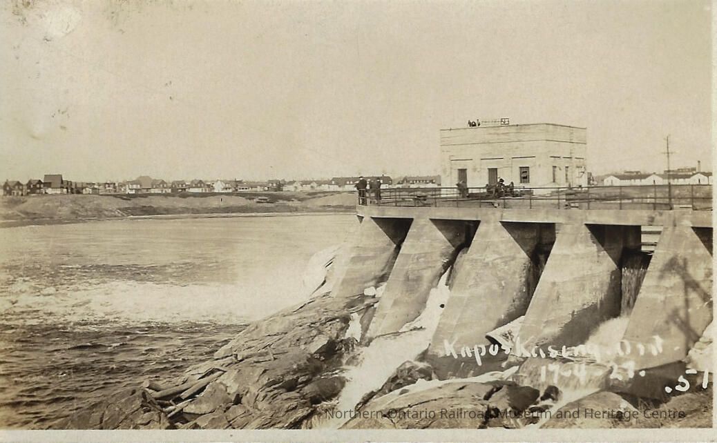 Postcard belonging to former Capreol mayor Harold Prescott. The postcard features an image of a dam with a lookout platform and another building. In the background a body of water as well as houses can be seen. The photograph was taken in Kapuskasing On in 1927.