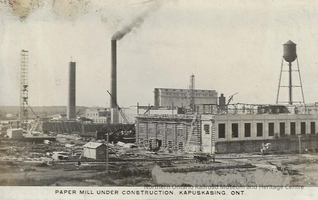 Postcard showing the paper mill under construction, circa 1950 in Kapuskasing Ontario. The postcard belonged to former Capreol mayor Harold Prescott. It shows a side view of the mill as well as railway tracks, a water tower, and several other buildings in the background.