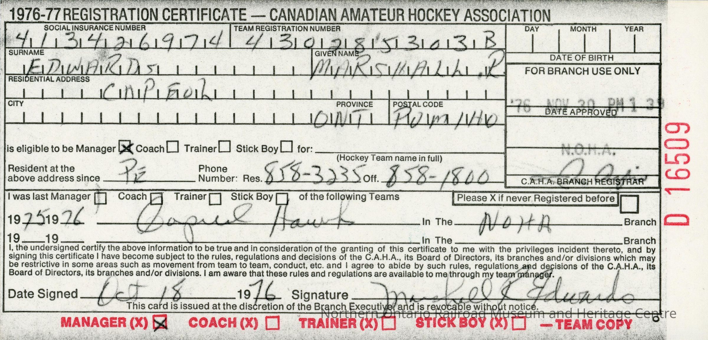 Hockey Coach/Manager Registration Certificate belonging to Marshall EdwardsEntry/Object ID