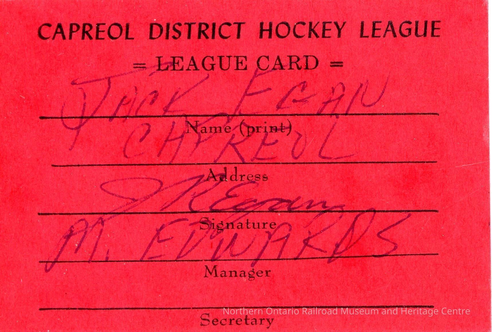 The card was used as an identifier for all players within the Capreol District Hockey LeagueCollection