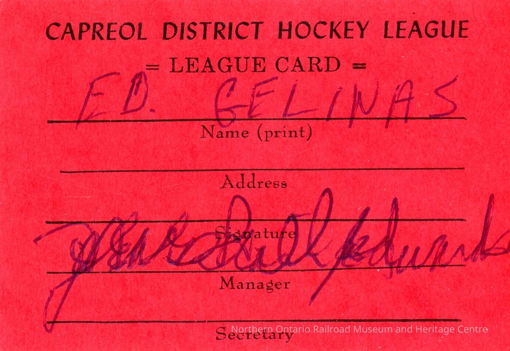 Hockey league's registration card for the Capreol District Hockey League belonging to Ed GelinasCreator