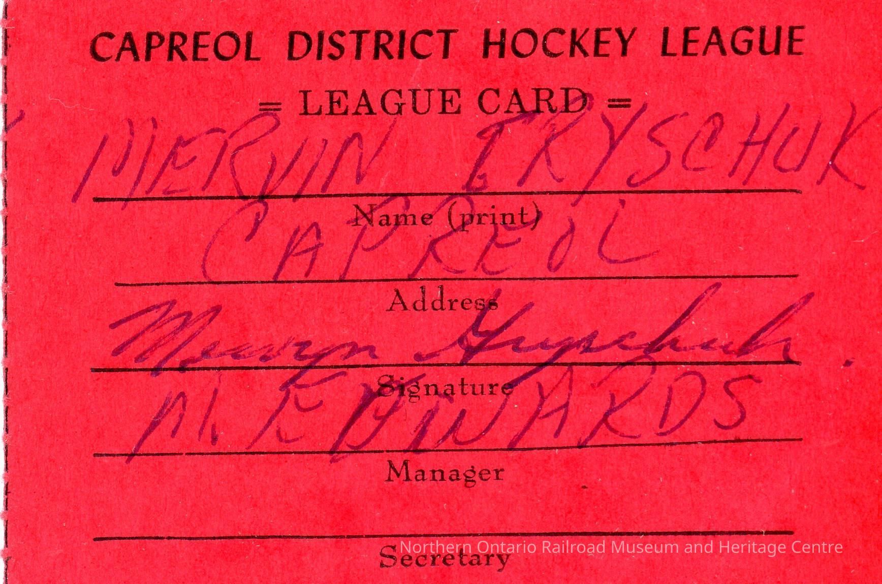 Hockey league's registration card for the Capreol District Hockey League belonging to Mervin GryschukContext