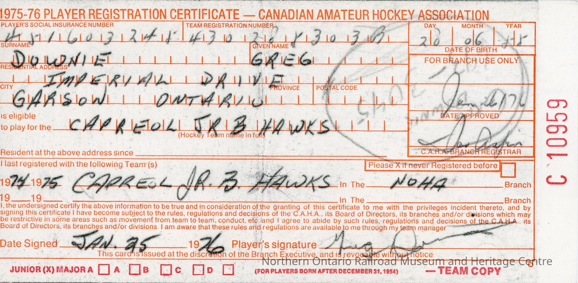 Player registration certificate for the Canadian Amateur Hockey Association belonging to Greg Downie for the 1975-1976 year.Creator