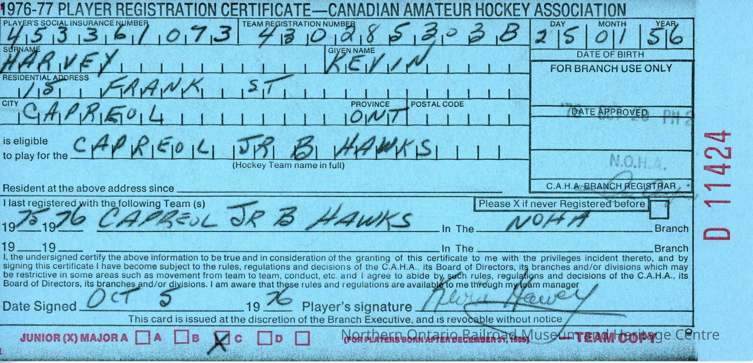 Hockey Player Registration Certificate belonging to Kevin HarveyEntry/Object ID