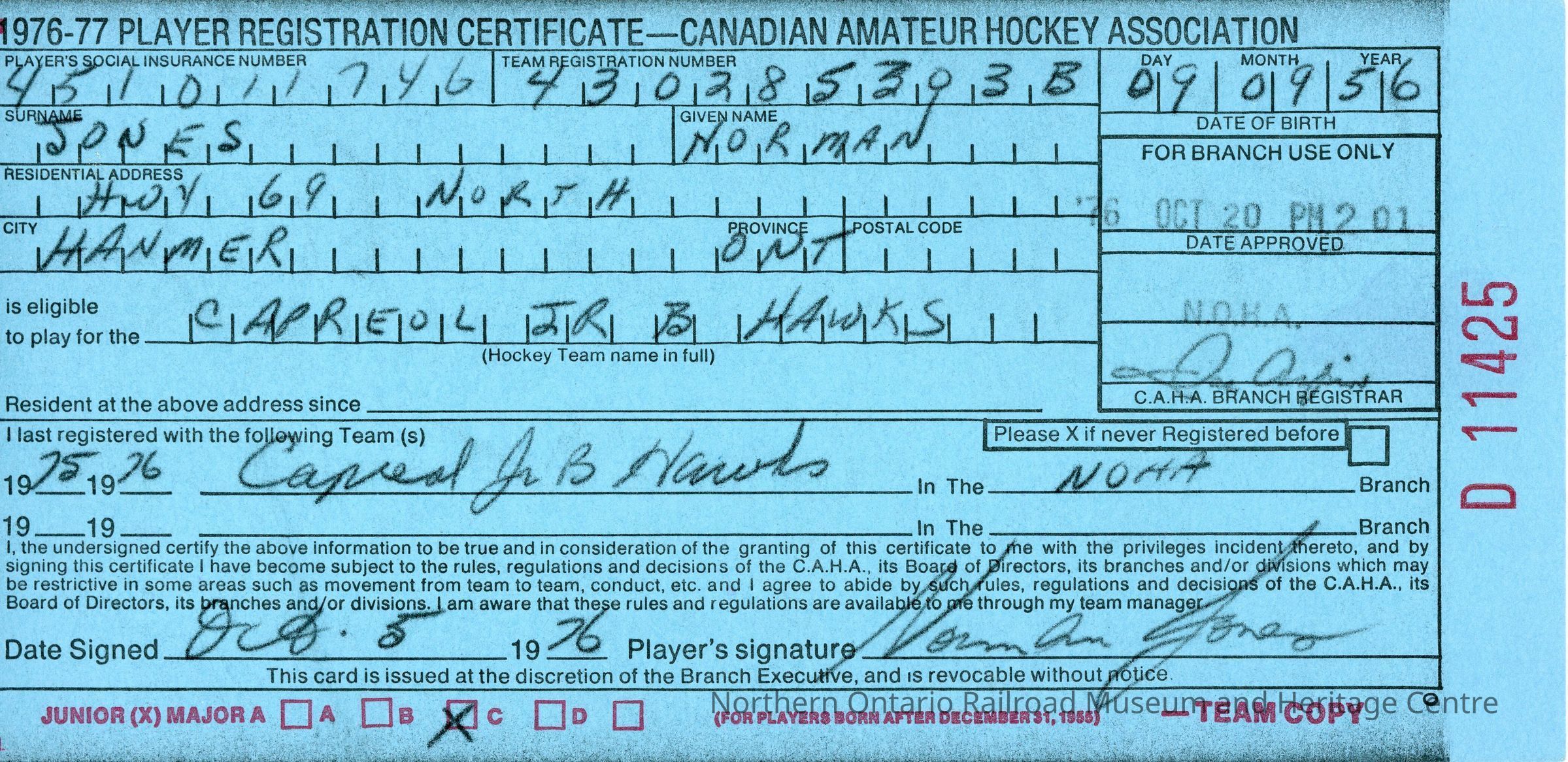 Hockey Player Registration Certificate belonging to Norman JonesEntry/Object ID