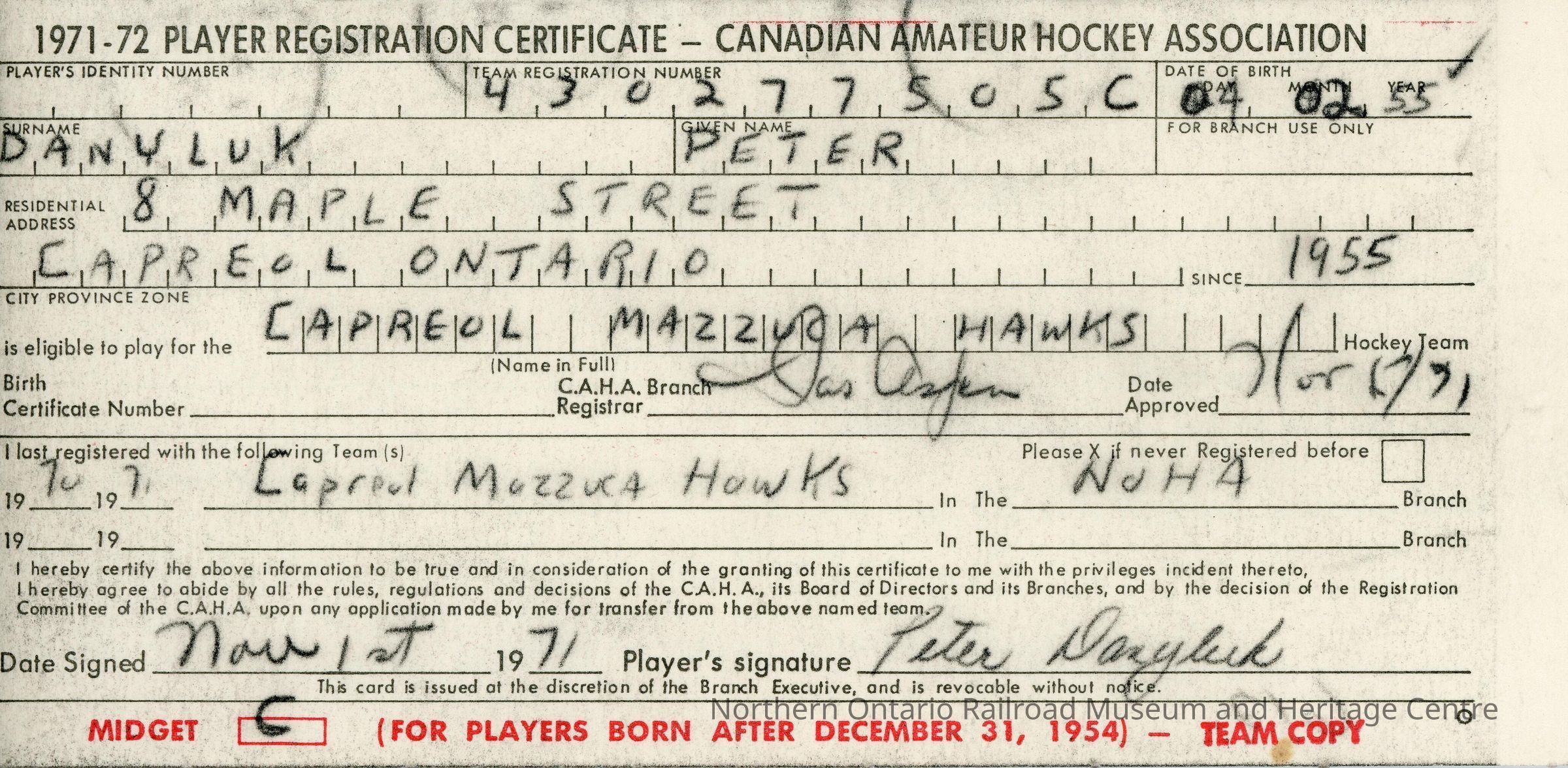 Player registration certificate for the Canadian Amateur Hockey Association belonging to Peter Danyluk for the 1970-1971 year.Creator