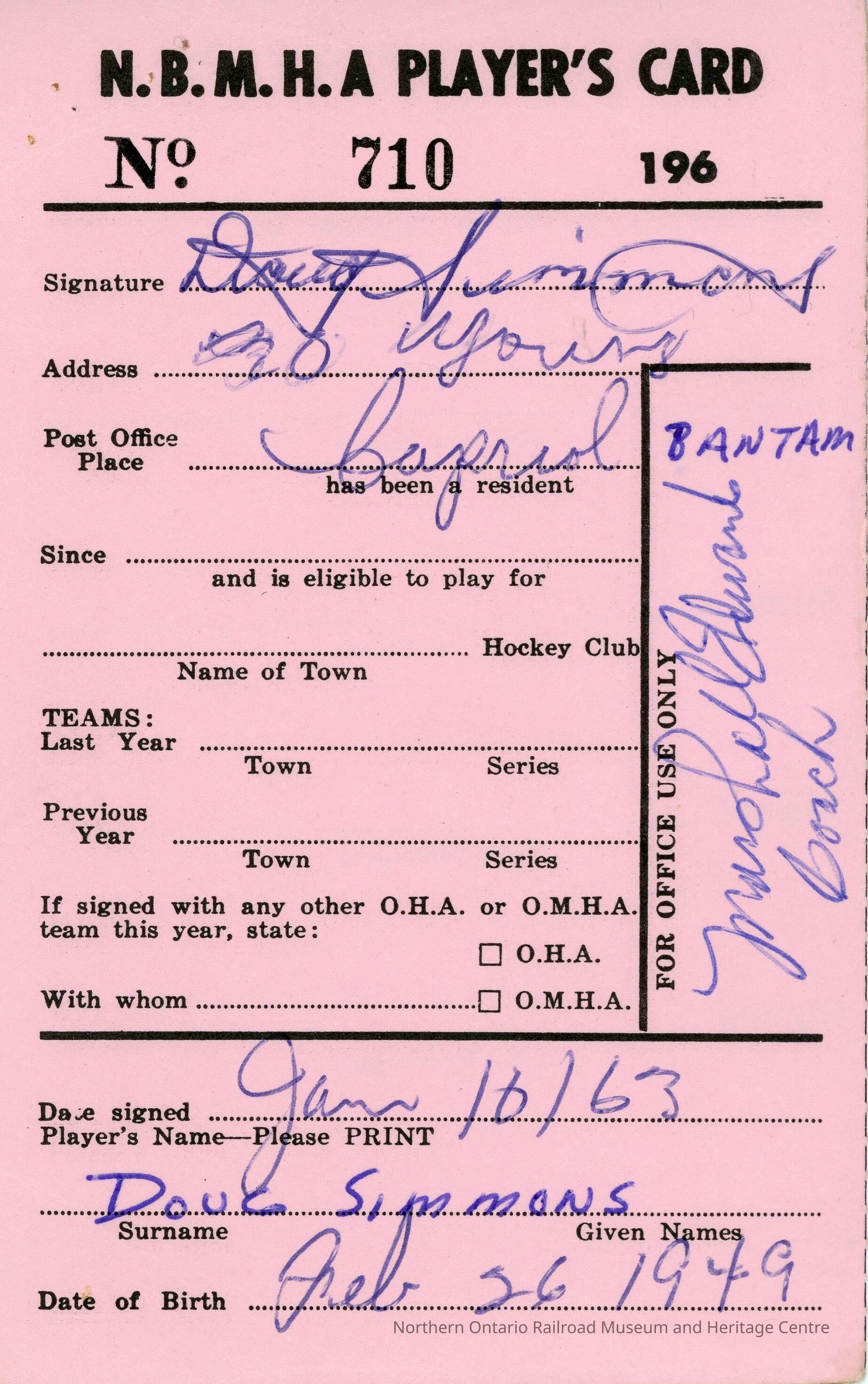 Hockey Player's registration card for the North Bay Minor Hockey Association belonging to Doug SimmonsCreator