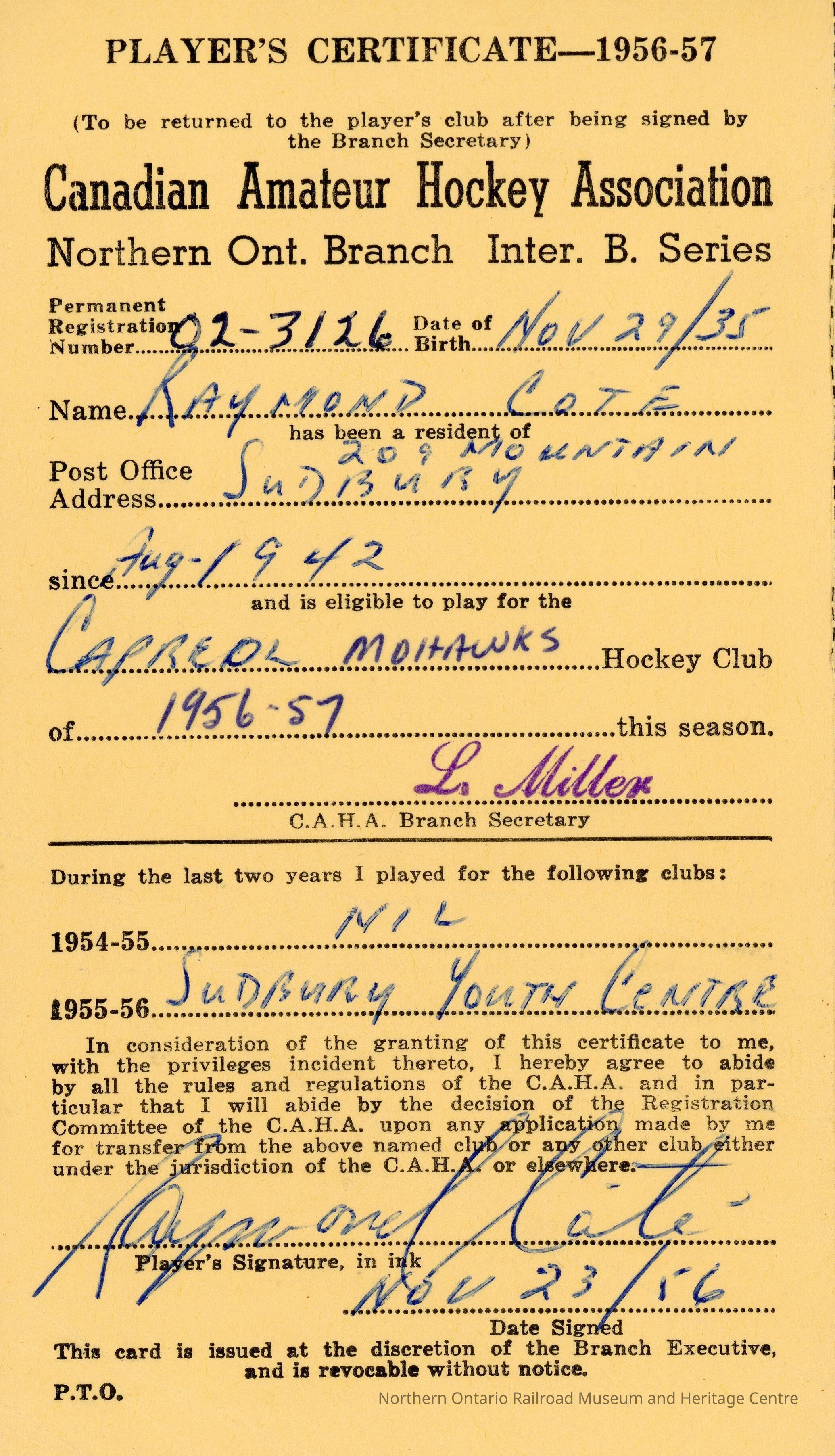 Player registration certificate for the Canadian Amateur Hockey Association belonging to Raymond Cote for the 1956-1957 yearContext