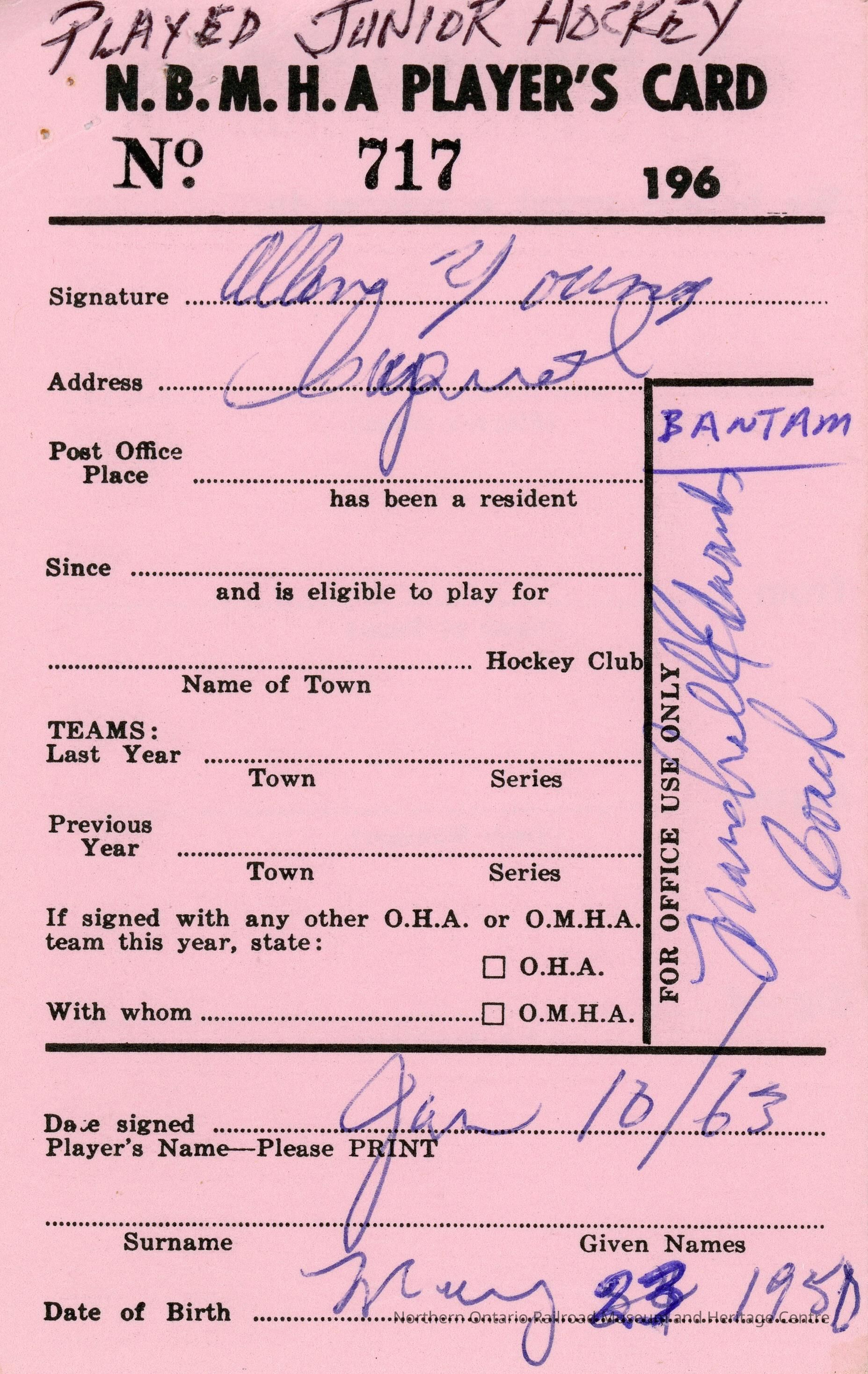 Hockey Player's registration card for the North Bay Minor Hockey Association belonging to Allan YoungContext